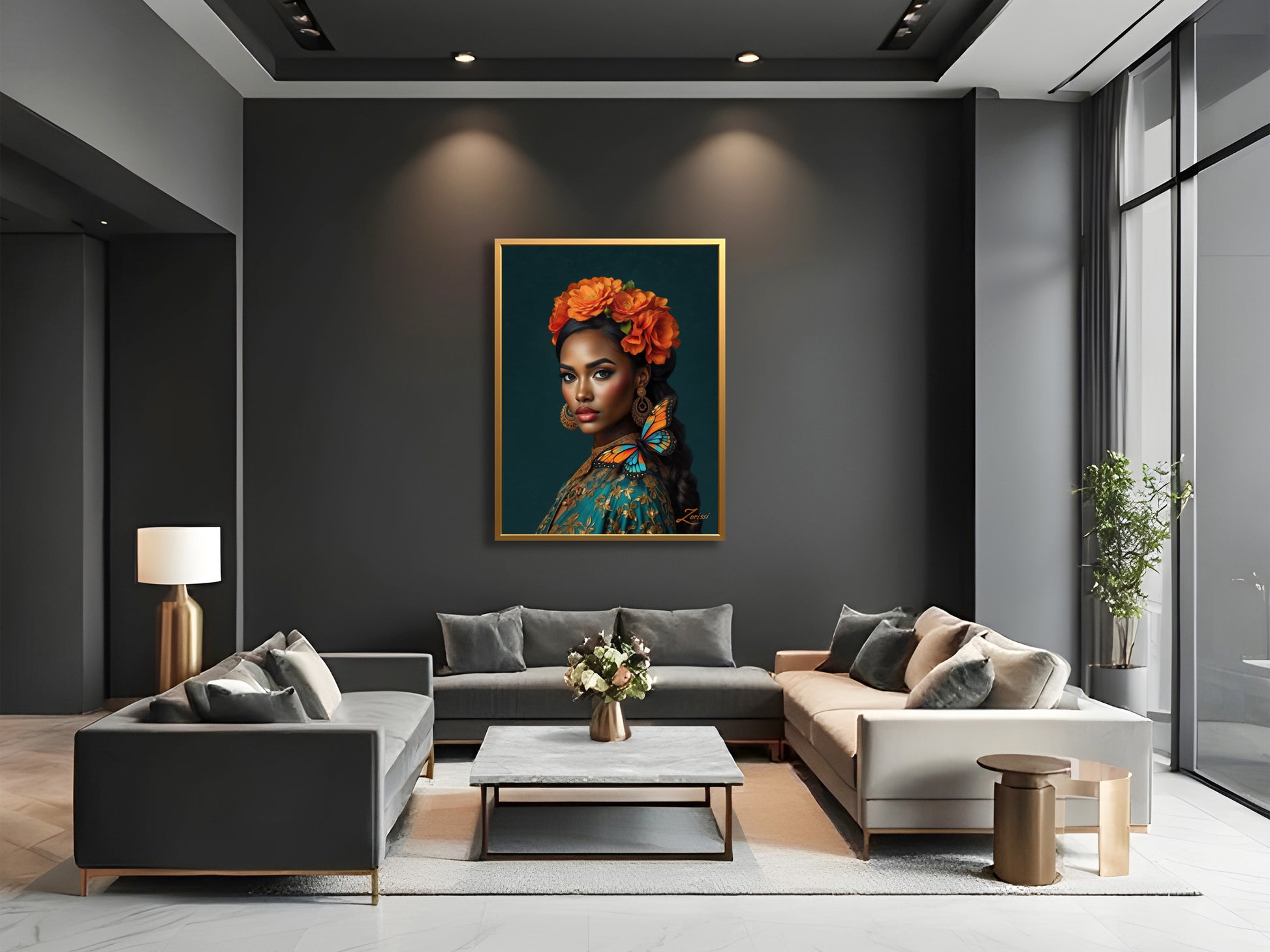 This captivating portrait celebrates feminine strength and transformation. The woman wears a crown of vivid orange flowers, symbolizing passion, creativity, and renewal. Her emerald gown, embroidered with gold florals, evokes heritage and abundance. A monarch butterfly rests on her shoulder, representing metamorphosis and the journey toward growth. With bold, graceful presence and serene confidence, she becomes a visual ode to beauty that evolves with purpose. The rich color palette of teal, gold, and orange enhances the symbolism of vitality and inner power.