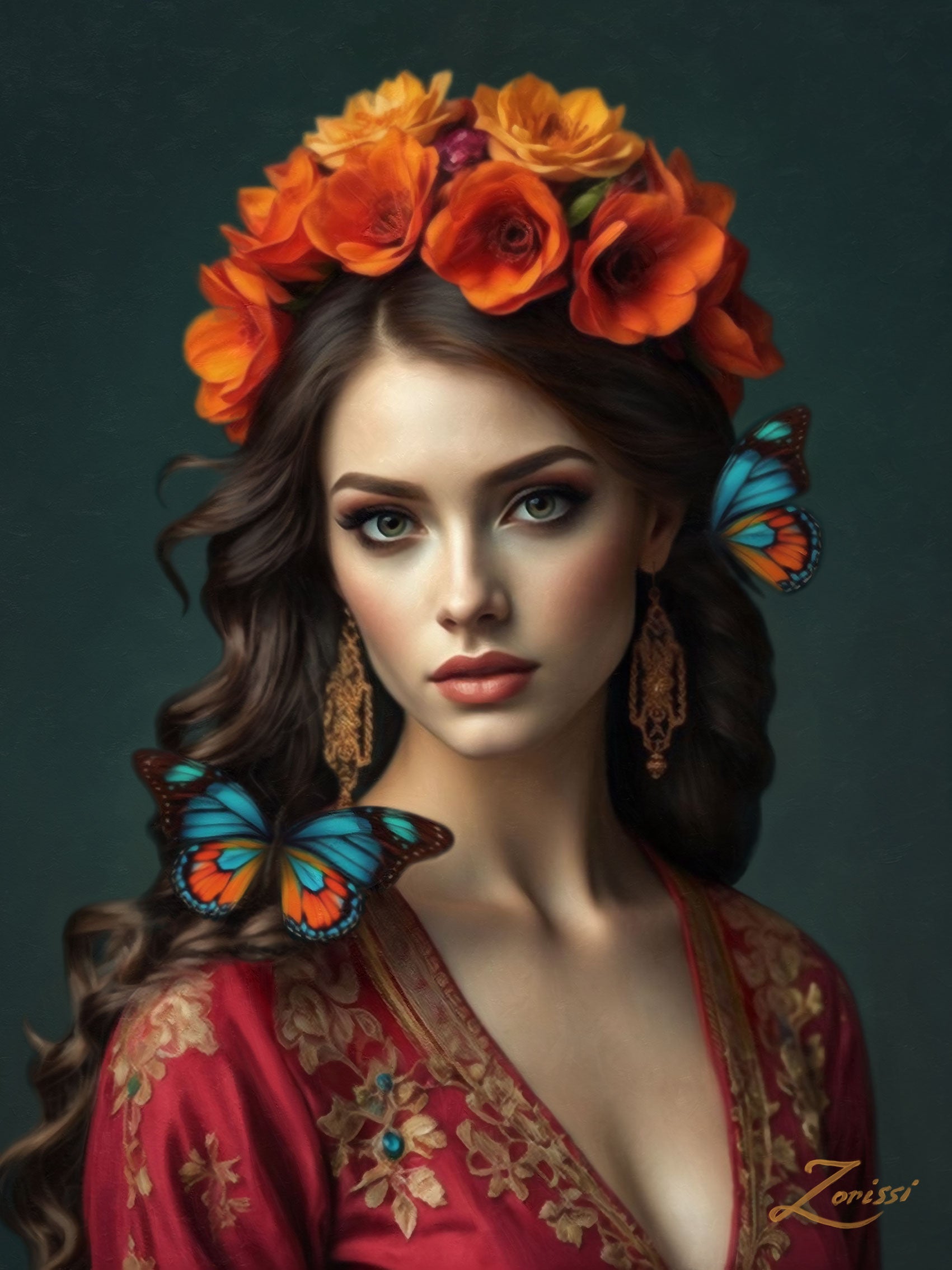 This radiant portrait is a soulful meditation on feminine essence, transformation, and inner light. Crowned with vibrant orange blossoms - symbols of creativity, vitality, and sacred fire - she emanates warmth and presence. Monarch and blue butterflies dance around her like messengers of growth and awakening, honoring the soul’s quiet evolution. Her floral-embroidered garment feels like an extension of the natural world, blooming gently with grace. Set against a deep green backdrop, this artwork invites us into the still beauty of becoming - alive, aware, and infinitely unfolding.